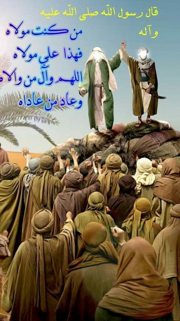 في اخر حجة الوداع للرسول الاعظم قبل ان ينتقل الي جوار ربة وقف في منطقة اسمها غدير خم بين مكة والمدينة والقاء خطبة على جميع الحجاج من جميع اقطار الارض وقال الست اولى بالمؤمنيين من انفسهم قالو بلاء يا رسول الله قال الست الولى بكم من انفسكم قالوا بلا قال الله مولاي وانا اولى بالمؤمنين من أنفسهم اللهم من كنت مولاه فهذا علي مولاه اللهم وال من والاه وعاد من عاده واخذل من خذله وانصر من نصرة. اللهم ادر الحق مع علي حيثما دارهذا اخي ووصيي وخليفتي من بعدي قال الشيخان بخا بخ يا ابن ابي طالب اصبحت ولي كل مؤمن ومؤمنه بارك له الشيخيين شهد هذا التنصيب الالهي مائة الف صحابي