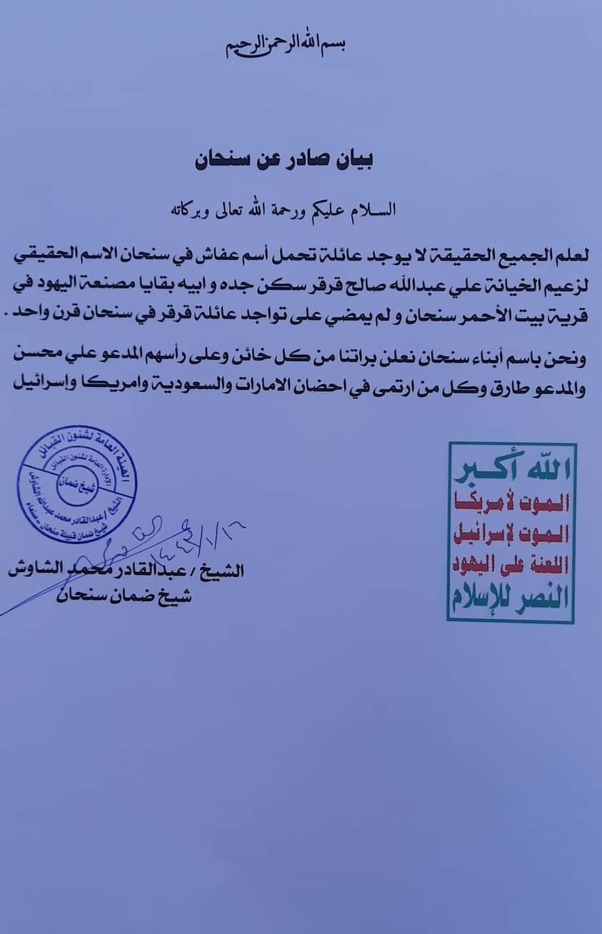 ولفت الشيخ الشاوش ان ابناء سنحان بكافة مشائخها ووجهائها وأفرادها يجددون اعلان براءتهم من الخونة والعملاء المرتمين في حضن امريكاء واسرائيل والامارات والسعودية، وفي مقدمتهم المدعوان علي محسن وطارق صالح..
