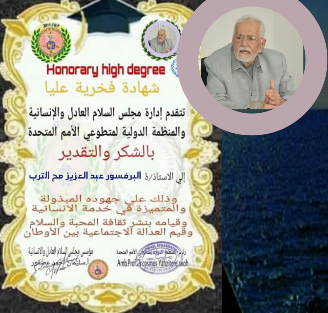 على منحنا شهادة شرفية علياء من مجلس السلام العادل والانسانية والمنظمة الدولية لمتطوعي الامم المتحدة