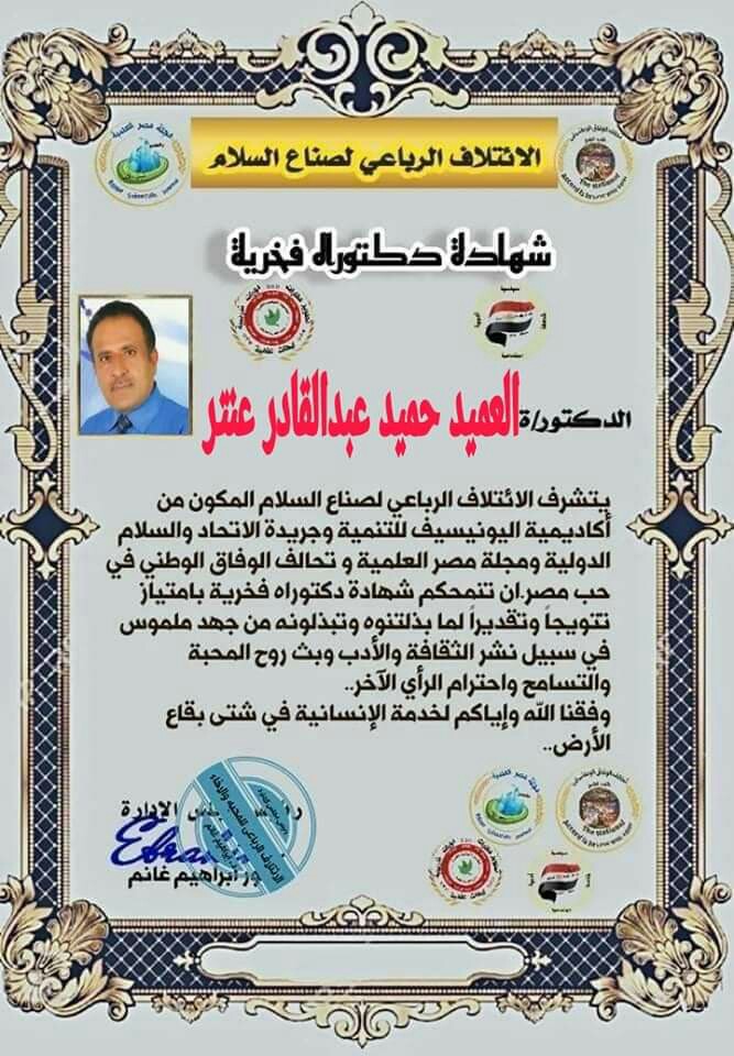 شكر وتقدير للائتلاف الرباعي لصناع السلام المكون من اكاديمية اليونسف للتنمية وجريدة الإتحاد والسلام الدولية ومجلة مصر العلمية وتحالف الوفاق الوطني في حب مصر على منحنا شهادة الدكتوراة الفخرية بإمتياز تتويجاً لنشر المحبة والثقافة والسلام اخوكم العميد/حميد عبد القادر عنتر مستشار رئاسة مجلس الوزراء رئيس الحملة الدولية لفك الحصار عن مطار صنعاء الدولي