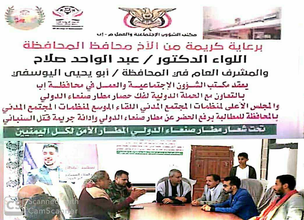 في محافظة إب الأبية والصامدة ، وبرعاية محافظ المحافظة اللواء الدكتور / عبدالواحد صلاح ، والمشرف العام في المحافظة الأستاذ / أبو يحي اليوسفي يعقد مكتب الشئون الاجتماعية والعمل بالمحافظة والتعاون والتنسيق مع الحملة الدولية لفك حصار مطار صنعاء وشريكها المجلس الأعلى لمنظمات المجتمع المدني لقاءآ موسعآ لمنظمات المجتمع المدني بالمحافظة
