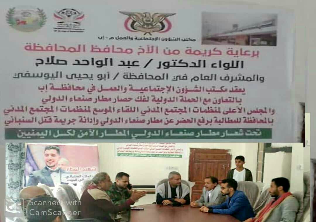 في محافظة إب الأبية والصامدة ، وبرعاية محافظ المحافظة اللواء الدكتور / عبدالواحد صلاح ، والمشرف العام في المحافظة الأستاذ / أبو يحي اليوسفي يعقد مكتب الشئون الاجتماعية والعمل بالمحافظة والتعاون والتنسيق مع الحملة الدولية لفك حصار مطار صنعاء وشريكها المجلس الأعلى لمنظمات المجتمع المدني لقاءآ موسعآ لمنظمات المجتمع المدني بالمحافظة