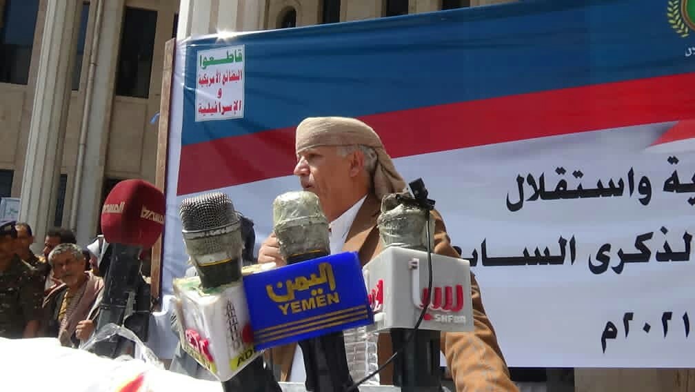 تلتها كلمة الأخ محافظ المحافظة اللواء عبد الواحد صلاح الذي رفع برقية التهاني للقيادة الثورية والسياسية ممثلة بسماحة السيد العلم عبد الملك بدر الدين الحوثي قائد الثورة ورئيس المجلس السياسي الأعلىٰ الأستاذ مهدي المشاط وأشار الأخ المحافظ أن ثورة ٢١سبتمبر ثورة شعبية شاركت فيها كل قبائل اليمن بمختلف مشاربهم الفكرية والسياسية والمذهبية ثورة تحرر وإستقلال وأنها الثورة التي أسقطت عروش الطغاة المتنفذة الفاسده ، ودعاء الأخ المحافظ إلىٰ الإبتعاد عن الشائعات والتراشق الإعلامي وتوحيد الصفوف و الخطاب الإعلامي وتماسك الجبهة الداخلية ودعاء كل قبائل اليمن إلىٰ النفير العام ورفد الجبهات والتحشيد والتصدي للعدوان العالمي والكل يستشعر المسؤلية الوطنية كون العدوان إستهدف اليمن من المهرة إلىٰ صعدة وإستهدف كل مقومات ومؤسسات الدولة والهدف من العدوان هو إحتلال اليمن والسيطرة علىٰ الجزر والسواحل وأتخذ العدوان من حكومة الفنادق مطية من أجل شرعنة الإحتلال وفي نهاية خطاب الأخ المحافظ شكر رجال الرجال أبطال الجيش واللجان الشعبية المرابطين في مواقع العزة والكرامة والذين سطروا أروع البطولات في مختلف الجبهات وفي العمق السعودي وأشار في ختام كلمته أن هناك مؤشرات بدأت تلوح في الأفق بالنصر والتمكين .