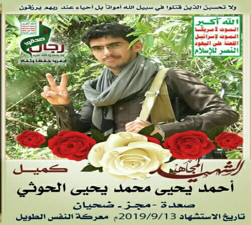 انا الشهيد بإذن الله /احمد يحيى محمد الحوثي أقول لكل من يسمعني من قول الله: بسم الله الرحمن الرحيم (كُتِبَ عَلَيْكُمُ الْقِتَالُ وَهُوَ كُرْهٌ لَكُمْ وَعَسَى أَنْ تَكْرَهُوا شَيْئًا وَهُوَ خَيْرٌ لَكُمْ وَعَسَى أَنْ تُحِبُّوا شَيْئًا وَهُوَ شَرٌّ لَكُمْ وَاللَّهُ يَعْلَمُ وَأَنْتُمْ لَا تَعْلَمُونَ}