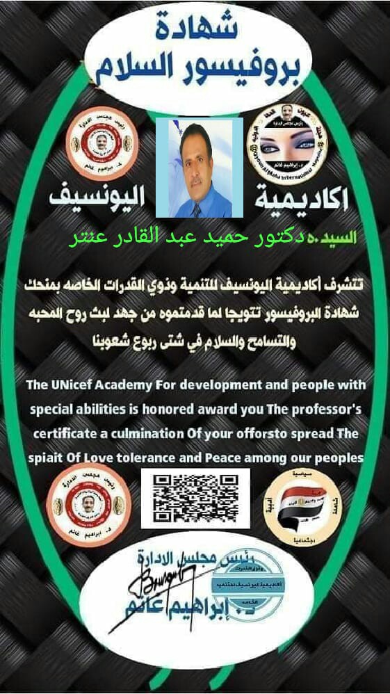 منظمه الوحده العربيه تمنح الاستاذحميد عبد القادر عنتر شهاده برفيسور السلام تتويجا لما بذلتوه بنشر المحبة والسلام في العالم والوقوف المشرف مع اليمن /يمن الحضارة والتاريخ