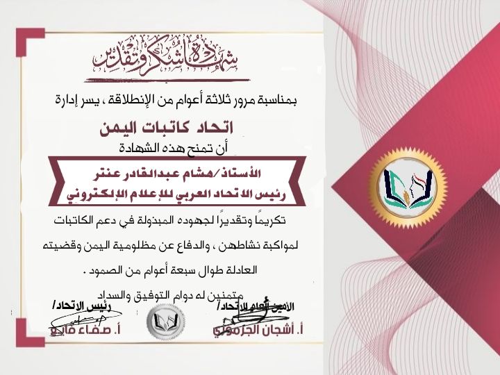 يسرني ويسعدني شهادة الشكر والتقدير من المجاهدات المؤمنات احفاد الزهراء عليها السلام ومحبات السيدة زينب عليها السلام ولي الشرف الكبير بهذه الشهادة التي سأضعها فوق رأسي خاصة إنها من احفاد الزهراء عليها السلام التي هي روح الوجود وأم ابيها وأم الكتاب وسأجعلها وسيلة بيني وبين الزهراء عليها السلام للشفاعة والرضا كما نلت من احفادك وبناتك والمؤمنات بك يا زهراء سأنال منك حسن الخاتمة لإنك الفاتحة والخاتمة والوسيلة لباب الوصول للسكن جوار سيد المرسلين سيدنا محمد وآله عليهم السلام وكما نلت هذا التقدير انا ايضا ابعث رسالتي لكل الكاتبات الشكر لهن وللإدارة في اتحاد كاتبات اليمن على تنظيمهن وترتيبهن وجهادهن نحن لم نتعب بعد تنظيمهن فالعمل سهل لإنهن يخرجين المقالات في أحسن صورة وهذه البركة هي من الكوثر عليها السلام التي تعطي نفحات منها لكل محبيها..